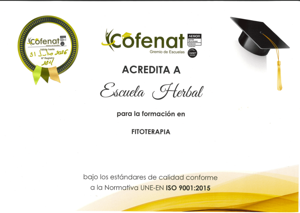 Nuestra Escuela herbal está acreditada como UNE-EN ISO 9001:2015 dentro del gremio de escuelas de la asociación de terapias naturales COFENAT.